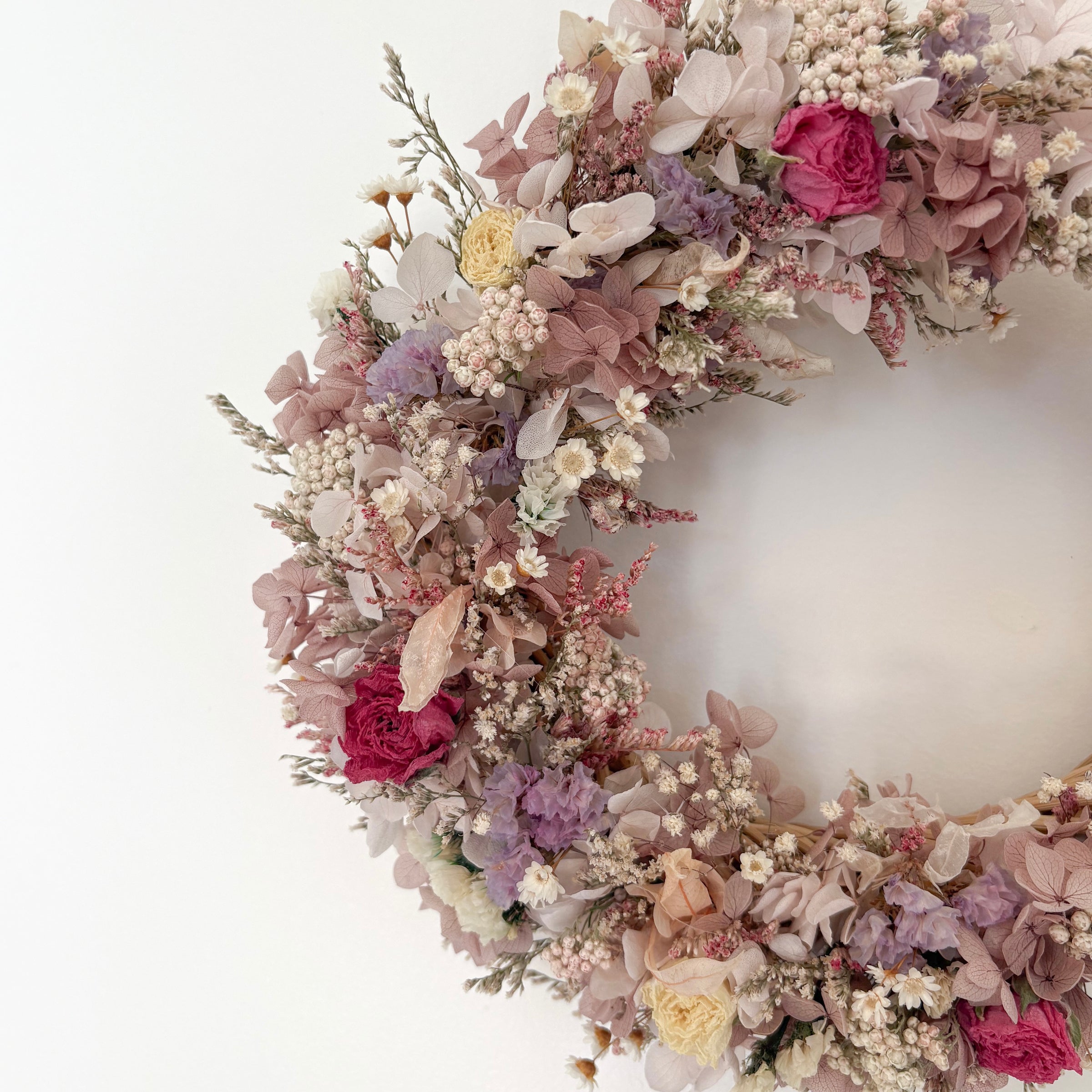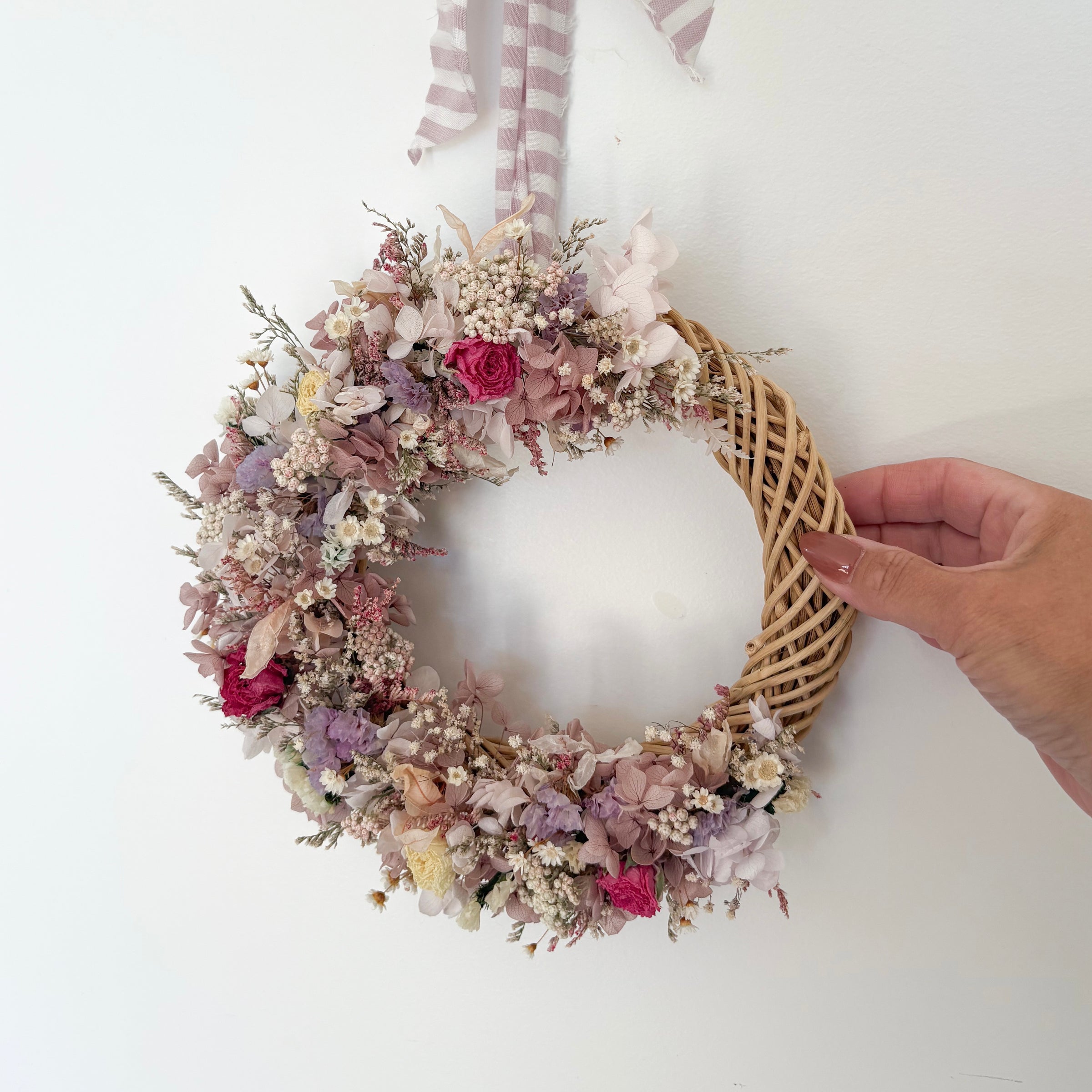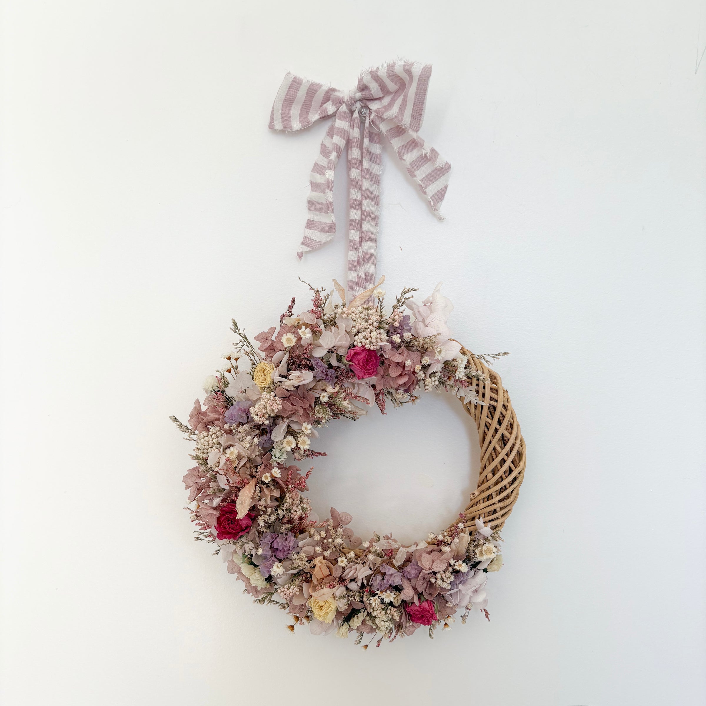 This beautiful wreath is packed full of naturally dried pastel coloured florals including hydrangea, straw flowers, ranunculus and much more. Designed with a hand cut bow, this can easily be removed if you would prefer no ribbon.
